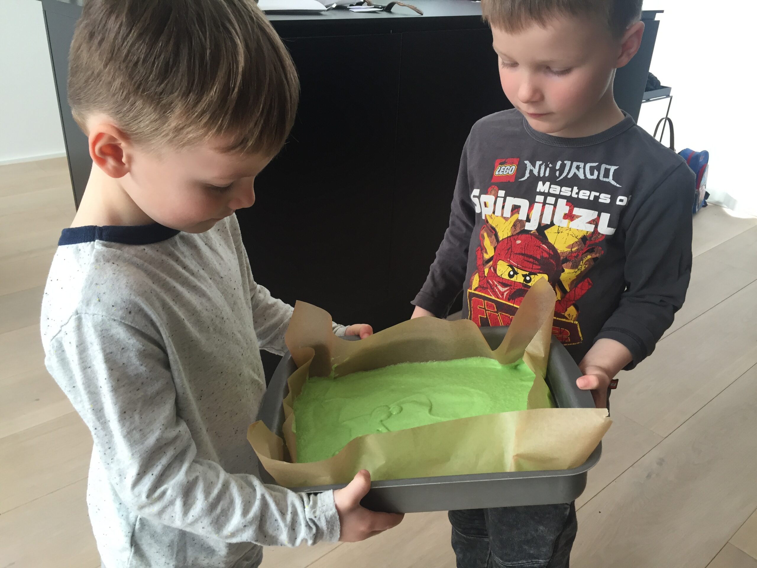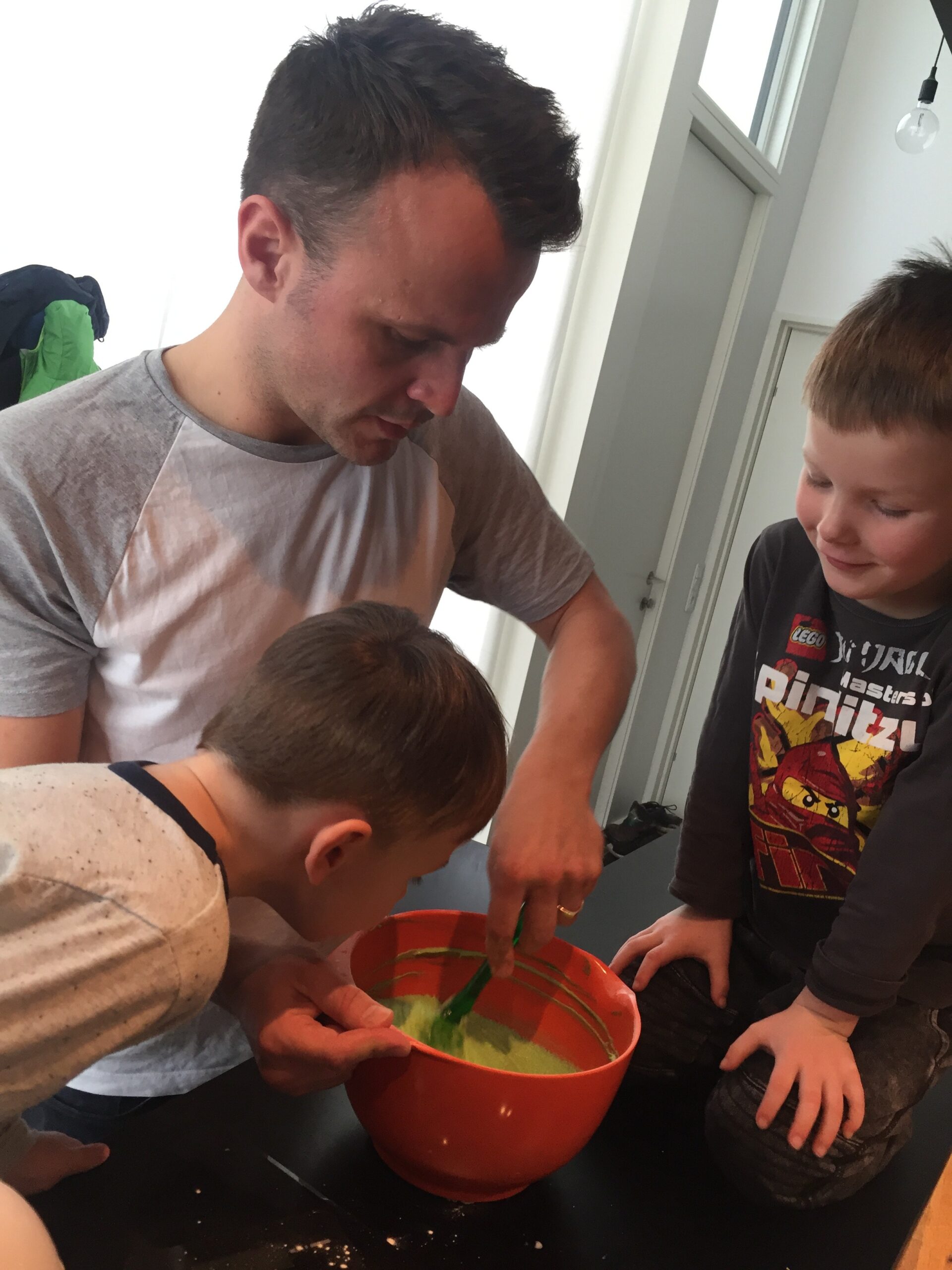 Far Tommy rører kagen sammen. DET var spændende!!De er nogle små kagemonstre, og en af de første gange de mødte mig, havde jeg bagt en kage (det gør jeg ret tit som I nok har lagt mærke til) og det har de ikke glemt! Så selvfølgelig skulle vi prøve at bage sammen. Jeg tænkte HULK KAGE 😉 Hulk, fordi de er vilde med superhelte, særligt Hulk, og så ser det bare super fedt ud for et barn når noget spiseligt er grønt og blåt 😛
