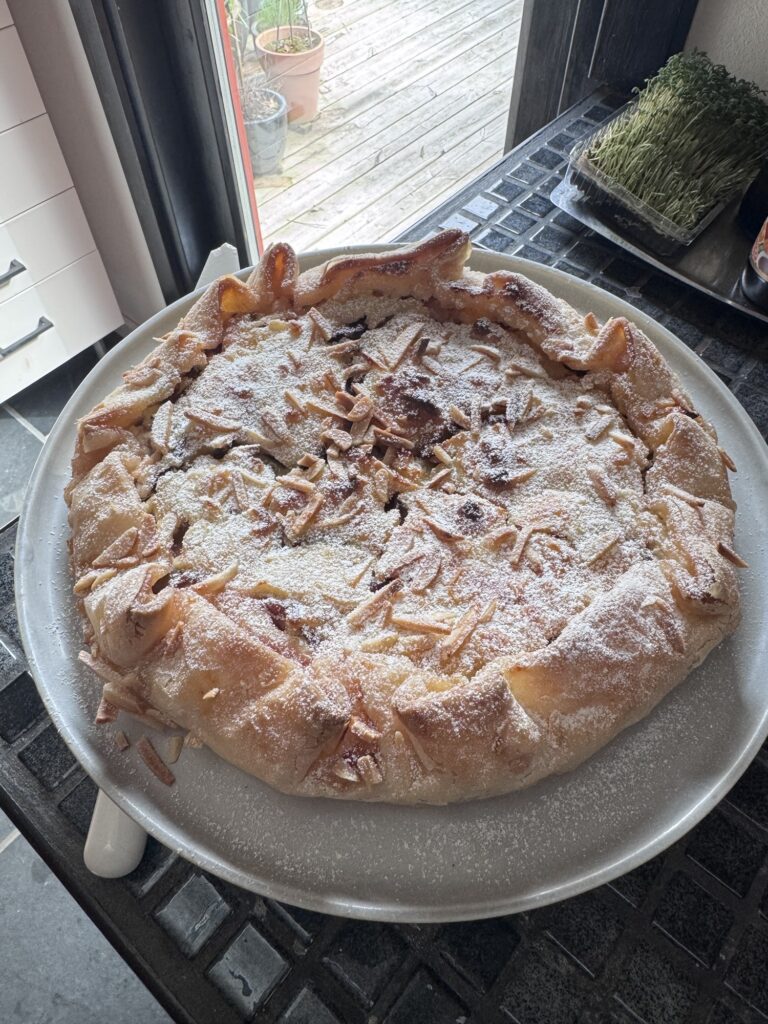 Jeg lavede en tærtemasse af revet marcipan, æg, creme fraiche og sukker og tøede nogle halve blommer op fra min fars have 😋 og så dryssede jeg med mandelsplitter.